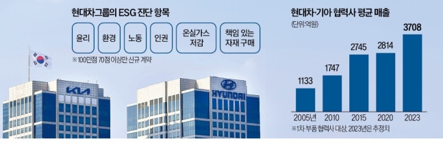 현대차그룹은 2021년부터 1차 협력사 300여 곳을 대상으로 ESG 평가를 해왔다. 이번 표준계약서 갱신은 그간의 평가에 근거한다. 다만 현대차그룹이 표준계약서를 갱신하더라도 당장 이를 2~3차 협력업체로 적용할 가능성은 낮다. 한 노무법인 관계자는 “중소 부품업체들의 열악한 상황을 고려하면 현대차의 이번 조치는 일종의 강력한 계도 방침이라고 보면 될 것”이라고 설명했다.